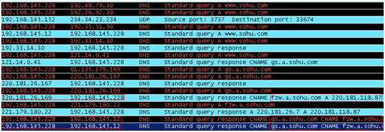 在192.168.145.228服務器上安裝上wireshark軟件,并打開它,設置數據包為UDP過濾,在192.168.145.12客戶機上用nslookup命令查詢一下www.sohu.com,馬上可以看到本地DNS服務器直接查全球13臺根域中的某幾臺,然后一步步解析,通過遞代的方式,直到找到www.sohu.com對應的IP為220.181.118.87。