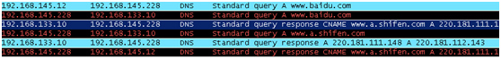 因www.sohu.com域名在第一步的驗證中使用過,有緩存,為了不受上步實驗干擾,我們在客戶機上192.168.145.12上nslookup www.baidu.com。從圖上看,本地DNS把請求轉發至192.168.133.10服務器,133.10服務器把得到的IP返回給本地DNS,然后本地DNS再把IP告訴DNS客戶機,完成解析。