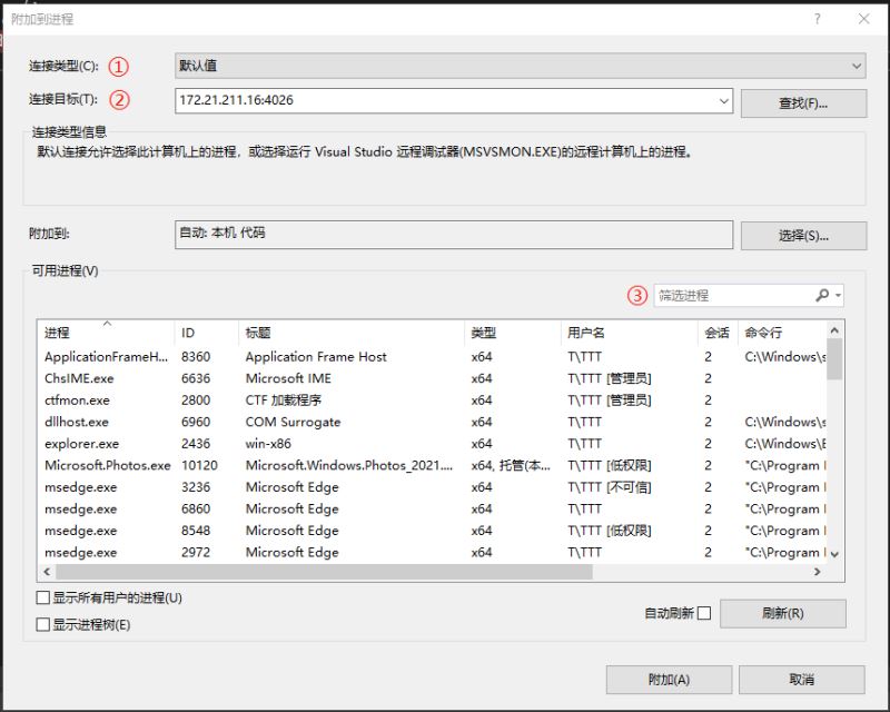 找到HelloWorld.exe,雙擊改進程或點擊附加按鈕,和附加本地進程一致。