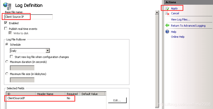 在”Base file name”字段中輸入“Client Source IP”;然后點擊”Select Fields”按鈕,并選擇”ClientSourceIP”;最后點擊”應用”,回到主頁;
