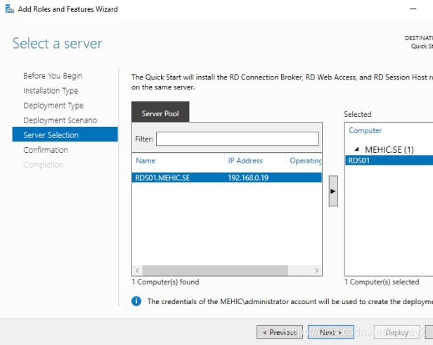 由于我們選擇了快速入門,因此將在單個服務器上安裝Connection Broker,Web Access和Session Host角色。點擊下一步