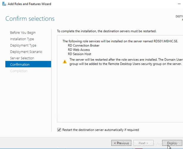 在“ 確認”頁面上,選中需要時自動重新啟動目標服務器的框 ,然后單擊“ 部署”。
