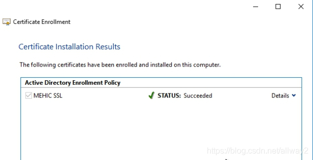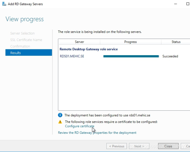 點擊下一步并添加。等待角色服務部署完畢,然后單擊“ 配置證書”以查看“證書選項”