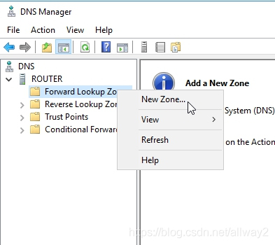打開DNS管理器,然后瀏覽到“正向查找區域”。右鍵單擊正向查找區域,然后選擇新區域
