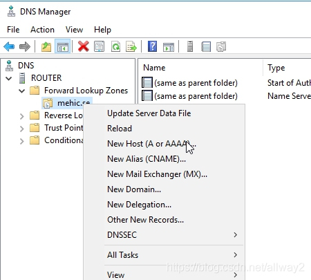 完成后,右鍵單擊新區域,然后選擇“新主機”(A或AAAA)