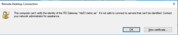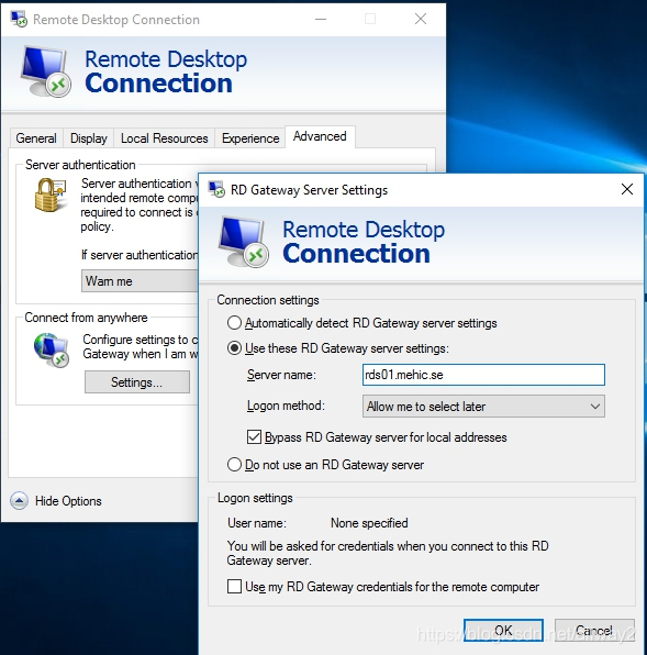 讓我們嘗試使用RDP連接到RDCB。只需打開運行(Windows Button + R)并輸入mstsc。輸入RDCB名稱,然后單擊“高級”選項卡