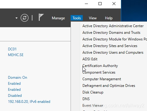 打開服務器管理器–>工具–>證書頒發機構