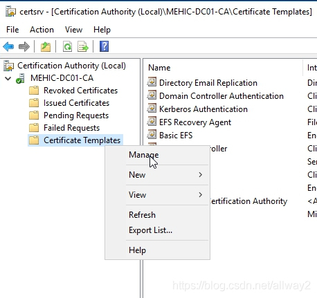 在CA管理單元中,右鍵單擊“證書模板”,然后選擇“管理”