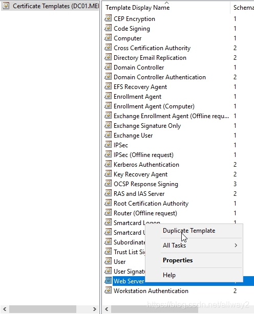 這將打開證書模板管理單元。我們需要做的是從這些模板中選擇一個并復制它,以便我們可以根據需要自定義它。對于遠程桌面,我們需要的大多數證書都是SSL。右鍵單擊Web服務器模板,然后選擇“重復模板”