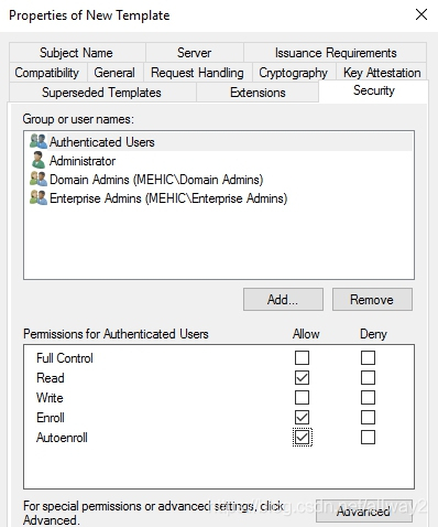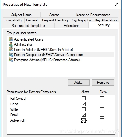 我們可以做很多事情,但最重要的是允許。因此,請單擊“安全性”選項卡,并授予“身份驗證的用戶”注冊和自動注冊的權限。(OBS!在現實生活中,您可能希望將該證書鎖定給特定的人,但在這種情況下,這并不重要。)我還將添加域計算機,并授予他們讀取,注冊和自動注冊的權限。完成后,單擊“確定”。