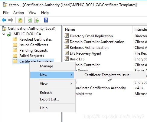 現在,我們需要獲取該模板并將其發布到CA。為此,請右鍵單擊證書模板–>新建–>要頒發的證書模板。