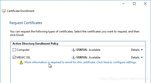 在“ 開始之前 和選擇證書注冊策略”頁上,單擊“下一步”。在“ 請求證書”頁面上,選擇MEHIC SSL,然后單擊鏈接。需要更多信息。(使用SSL,我們必須提供其他信息)