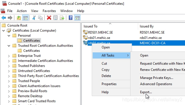最后一步是注冊證書。切換到RDS01并打開MMC(Windows按鈕+ R并輸入mmc),右鍵單擊Personal-> All Tasks-> Request New Certificate