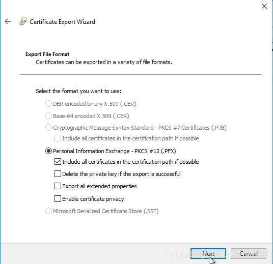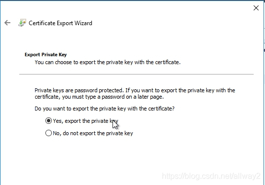 歡迎導出向導將彈出。點擊下一步。選擇是,導出私鑰,然后單擊下一步