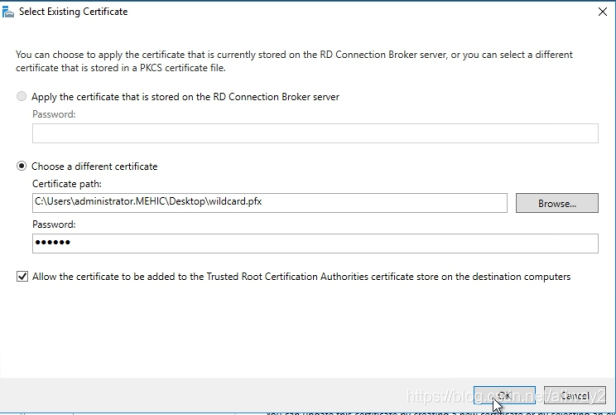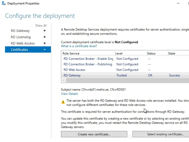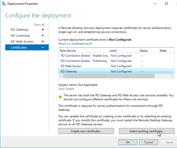 現在,讓我們回到“部署屬性”并選擇RD網關–>選擇“現有證書”