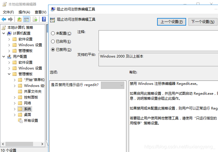 運行 gpedit.msc,在用戶配置 - 管理模板 - 系統中修改組織訪問注冊表編輯工具為已禁用