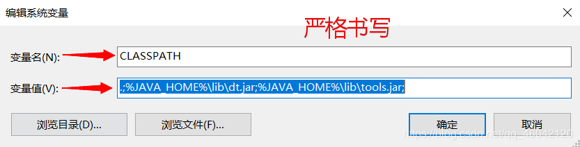 - 語句錯誤:CLASSPATH的變量值錯誤,開頭一定有點“.”!!!(直接復制粘貼,見下文。)