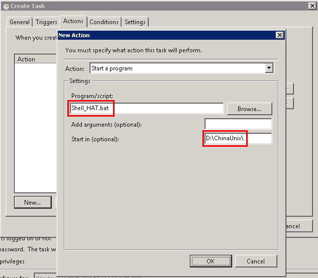 我今天也被這個(gè)問題給坑了,幾乎花了一天的時(shí)間來排錯(cuò)。單獨(dú)執(zhí)行bat腳本一切正常,在Windows 2003的任務(wù)計(jì)劃里面執(zhí)行bat腳本也沒有問題,但是只要放到Windows 2008的任務(wù)計(jì)劃里面就不行。在國(guó)內(nèi)、國(guó)外的網(wǎng)站上一通搜索,終于湊齊了所有的注意事項(xiàng)。步驟總結(jié)如下: