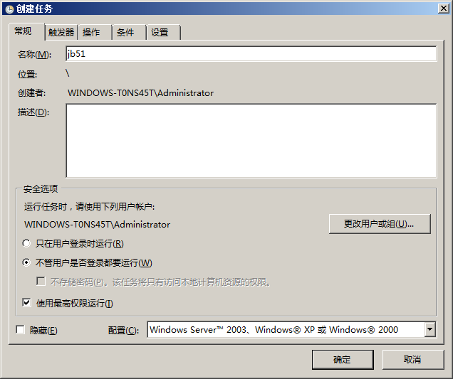 3、在 General 選項(xiàng)卡中選擇 Run whether user is logged on or not,并勾選 Run with highest privileges,然后從下拉列表里面選擇 Windows Server 2003,這里千萬不能選擇 Windows Server 2008