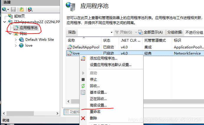 11.再去選擇應用程序池選擇新進建的網站,右擊選擇高級設置