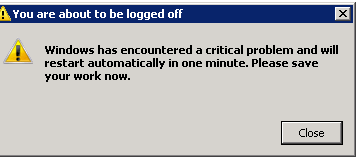 “Windows has encountered a critical problem and will restart automatically in one minute. Please save your work now.”