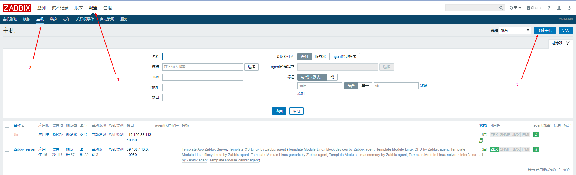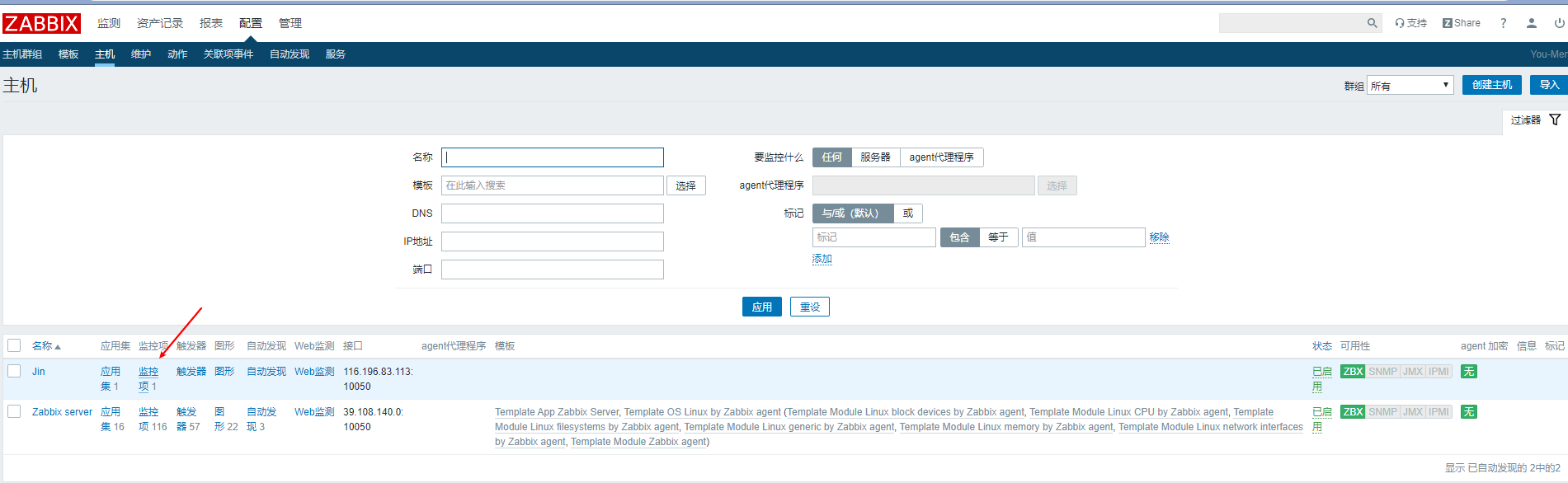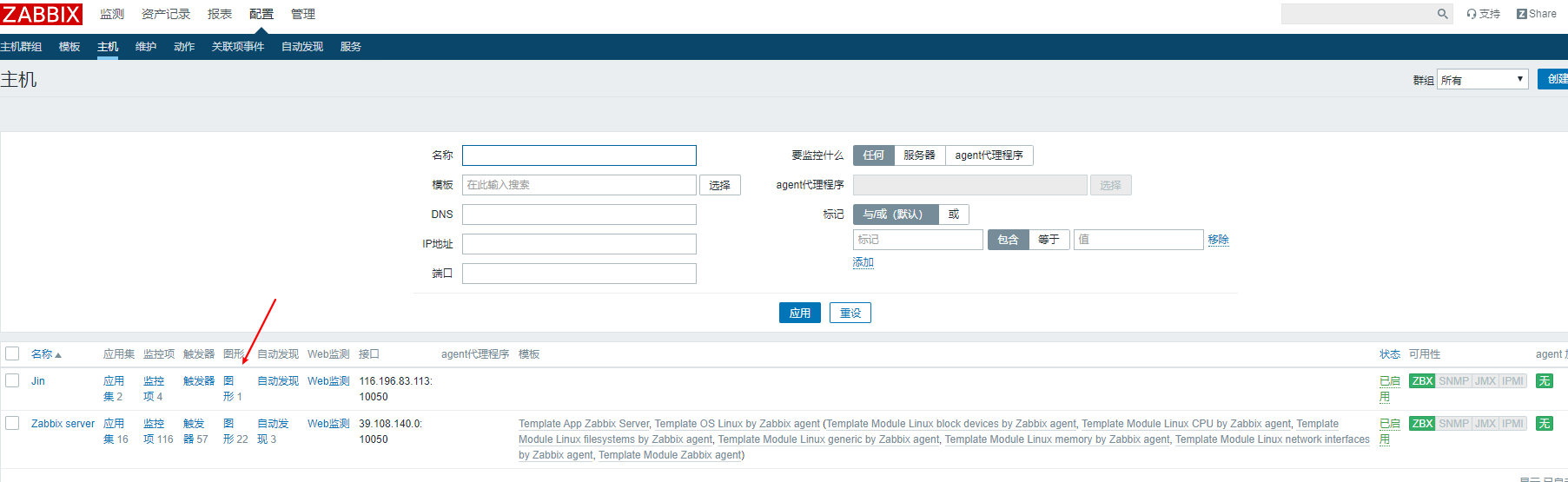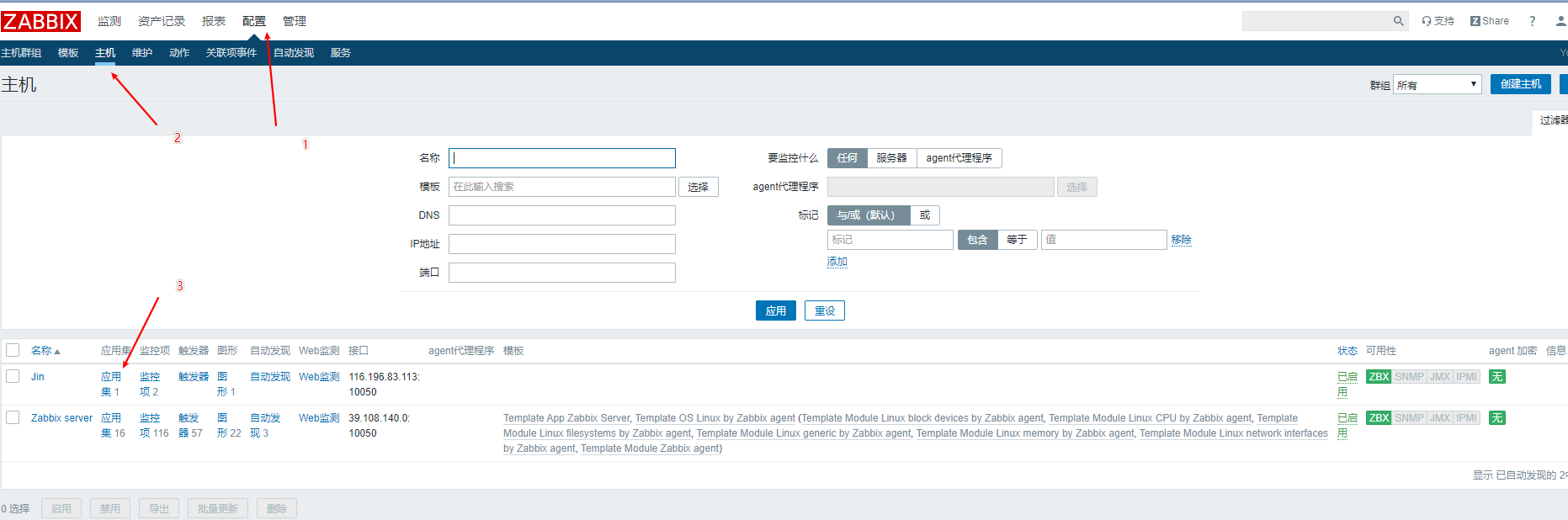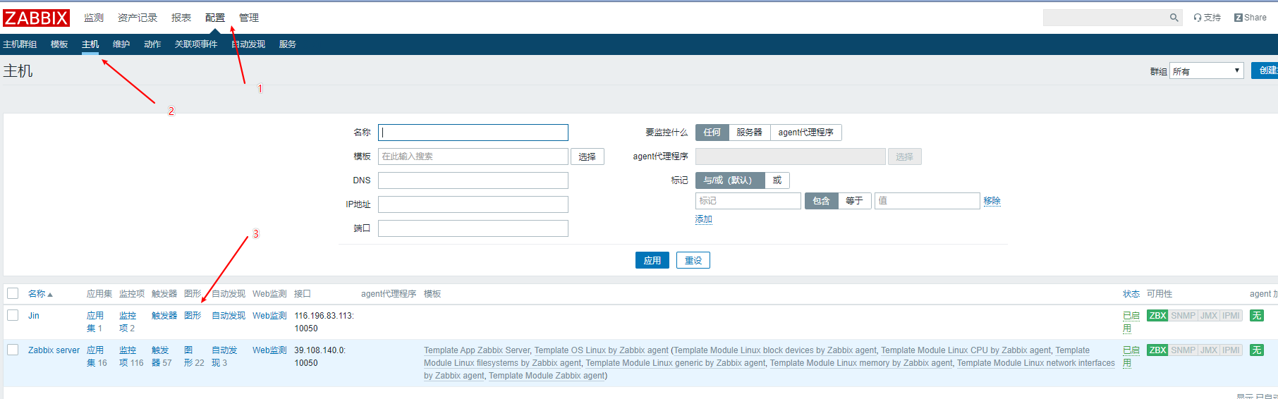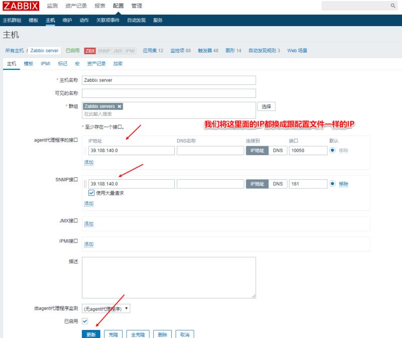 接下來(lái)我們到web界面上配置如何監(jiān)控本地主機(jī),我們看到接口上是127.0.0.1,但是我們配置文件寫的是39.108.140.0,我們讓這兩個(gè)IP一致.點(diǎn)擊3進(jìn)去然后修改.