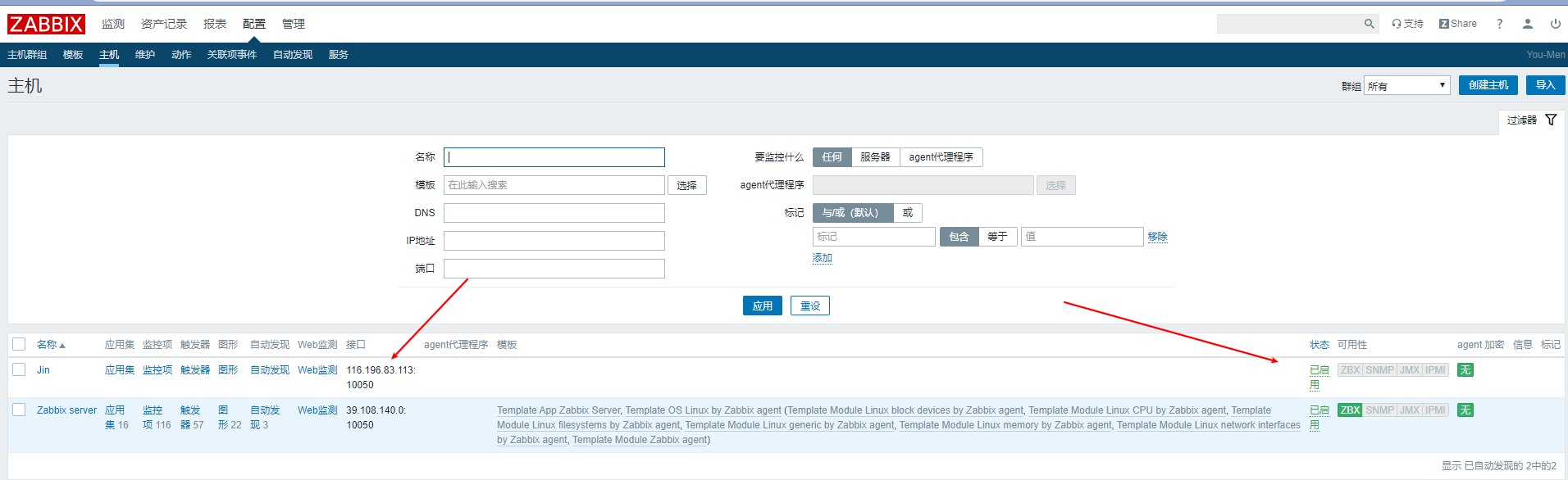vim /etc/zabbix/zabbix_agentd.confServer=39.108.140.0 # 被動(dòng)模式 zabbix-server-ipServerActive=39.108.140.0 # 主動(dòng)模式 zabbix-server-ipHostname=You-Men # Agent端主機(jī)名,最終顯示在監(jiān)控頁(yè)面上的名字UnsafeUserParameters=1 # 是否限制用戶自定義keys使用特殊字符systemctl restart zabbix-agentnetstat -antp|grep agenttcp 0 0 0.0.0.0:10050 0.0.0.0:* LISTEN 3898/zabbix_agentd tcp6 0 0 :::10050 :::* LISTEN 3898/zabbix_agentd