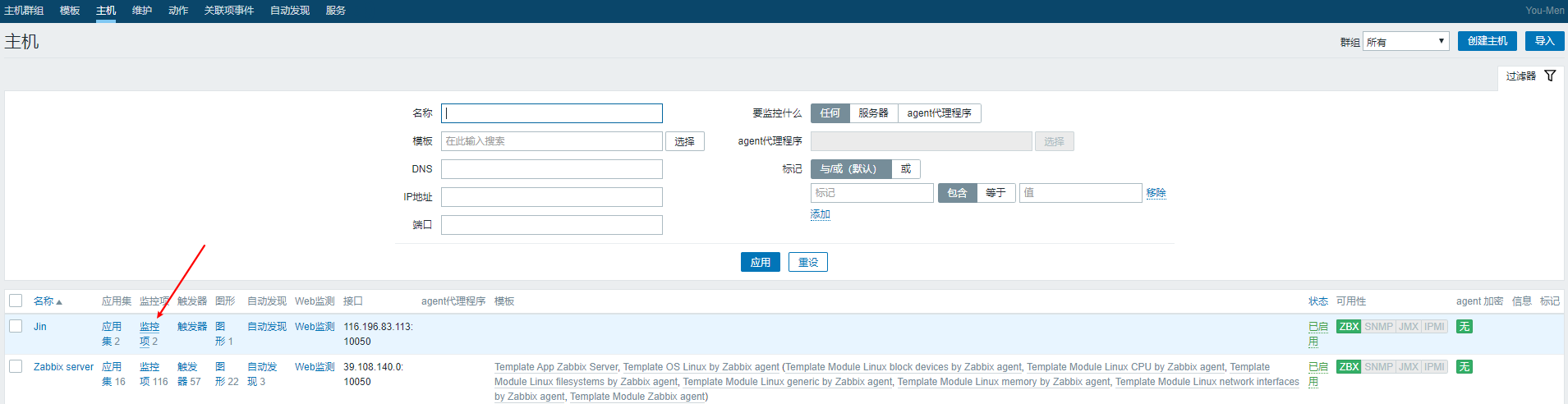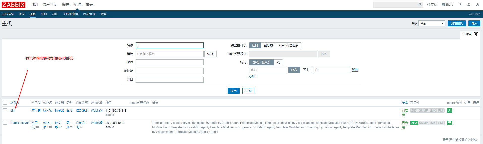 如果等上一段時(shí)間,可用性哪里沒有紅色警告,就說(shuō)明這臺(tái)主機(jī)被添加進(jìn)來(lái)了,但是因?yàn)闆]有掛載模板和創(chuàng)建監(jiān)控項(xiàng),所以我們接下來(lái)嘗試著掛載一下模板,然后再去創(chuàng)建監(jiān)控項(xiàng).