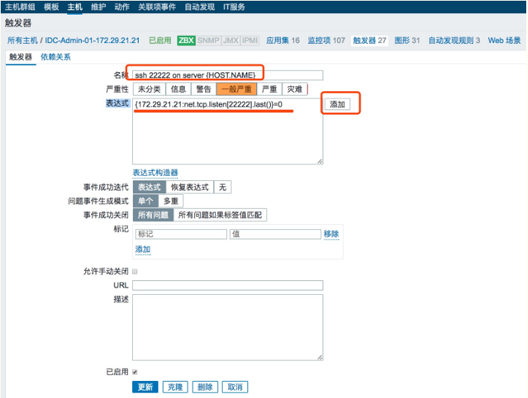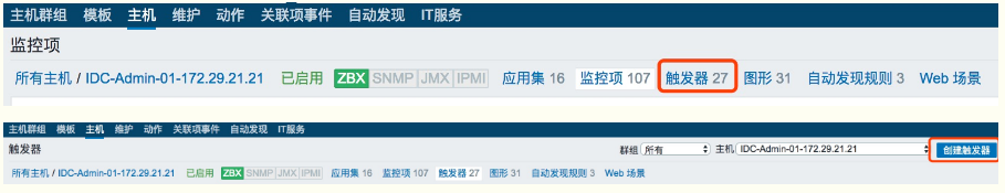 選擇主機(jī),點(diǎn)擊【觸發(fā)器】,【創(chuàng)建觸發(fā)器】