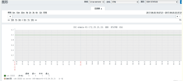 最后就可以在該主機(jī)的監(jiān)控圖形中查看到上面添加的ssh端口狀態(tài)了:1表示該端口正常運(yùn)行,0表示該端口關(guān)閉。
