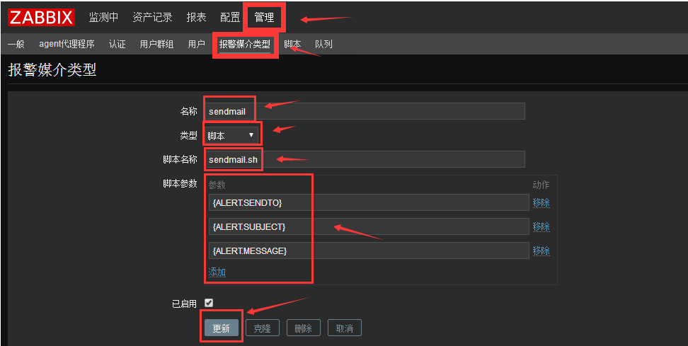 配置zabbix圖形化--管理--報警媒介類型--右上角創建媒體類型--傳入三個參數