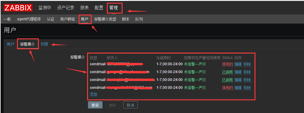 配置收件人和用戶權限--管理--用戶--報警媒介--選擇sendemail.sh腳本,輸入收件人的郵箱地址