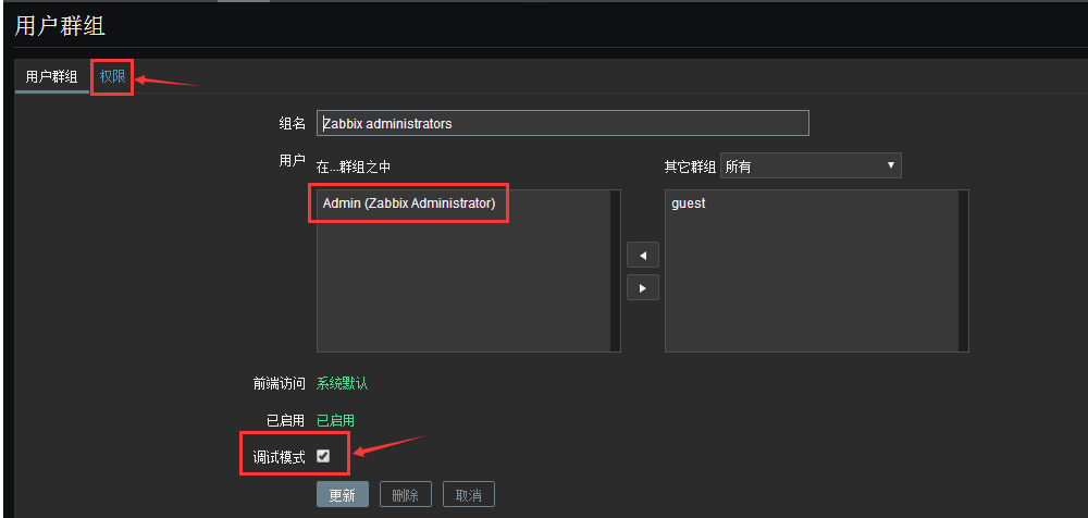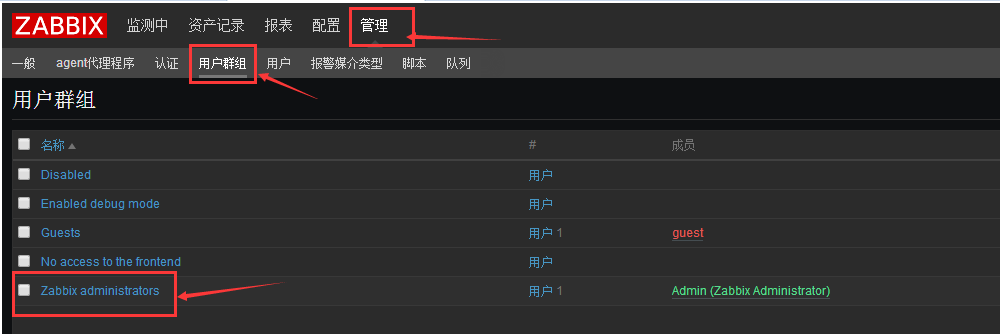 添加權限--管理--用戶群組--選擇Zabbix administrator組