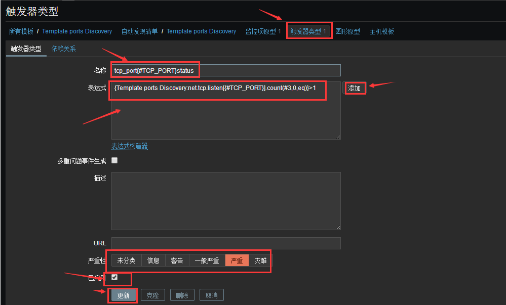注意這里的表態示count(#3,0,eq) > 1表示最近3次的返回值為0,這個條件觸發一次則報警.