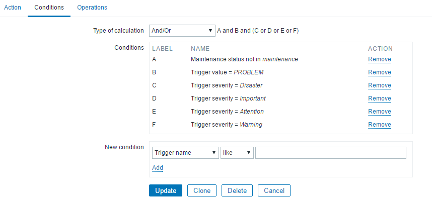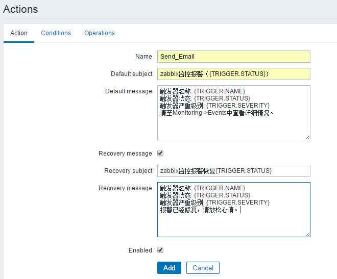 創建action實現郵件報警Configuration –> Actions –> Create action