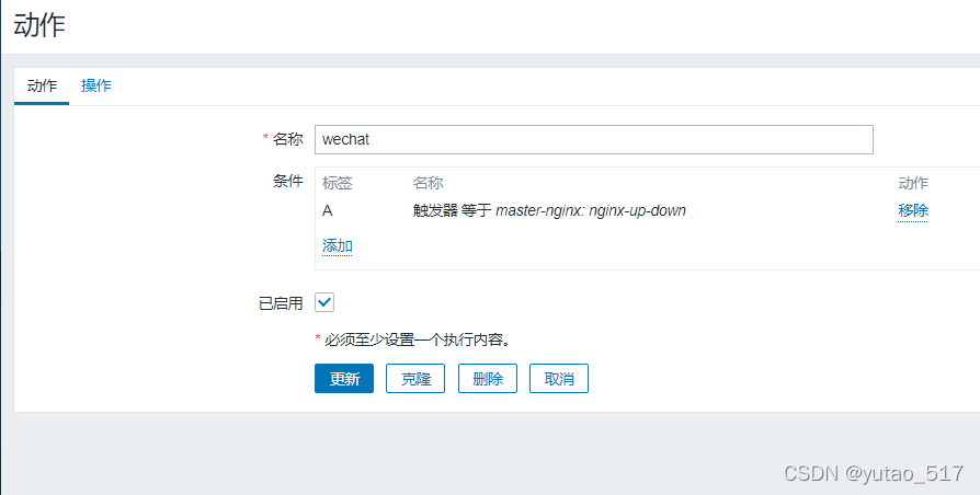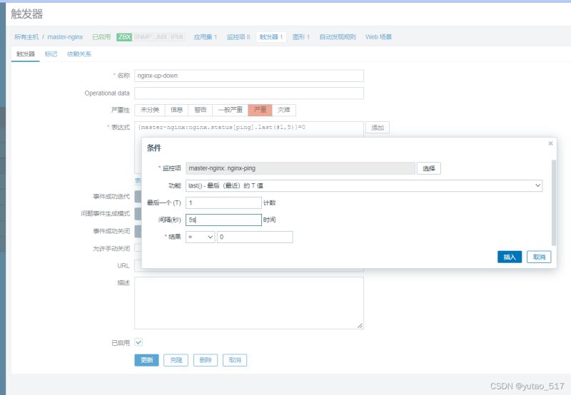 自定義觸發(fā)器nginx-up-down,監(jiān)控項(xiàng)為nginx-ping,正常為1,每5s監(jiān)控一次,若為0,嚴(yán)重警告。