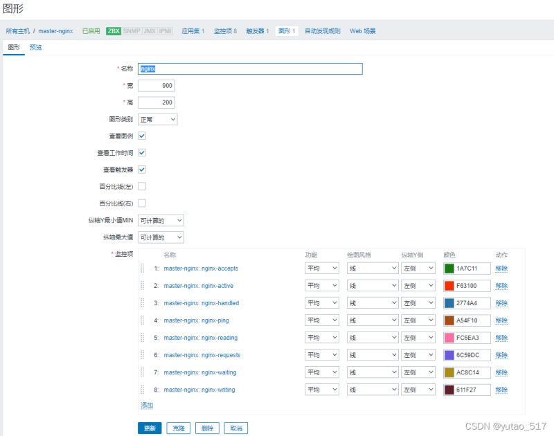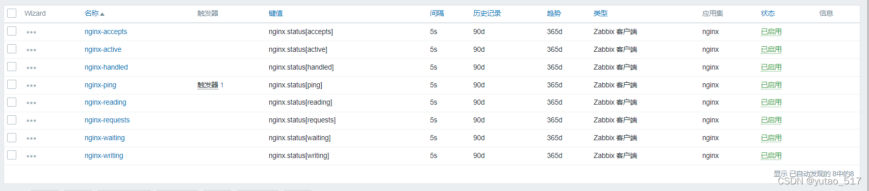 除nginx-ping,nginx-accepts外,需要添加所有狀態(tài)監(jiān)控項(xiàng),只有nginx-ping創(chuàng)建觸發(fā)器,這里不一一舉例。