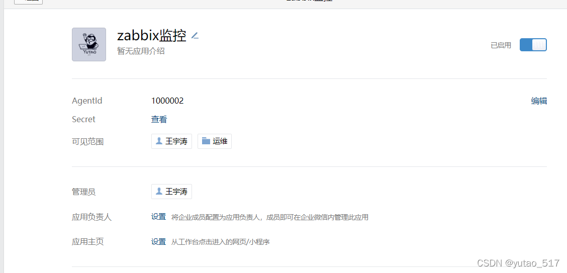 創(chuàng)建成功后,查看信息記住自己的AgentId和Secret