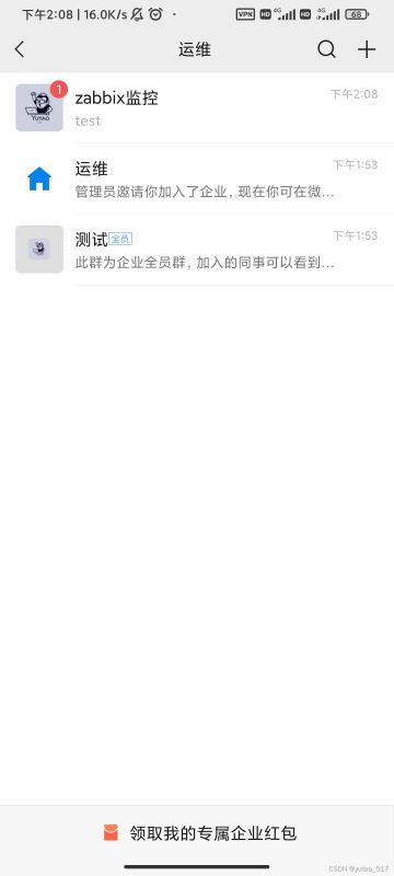 #!/bin/bashCorpID="wwaa6fb8ff1b81aa77" # 你的企業(yè)idSecret="Cxyd*****" #你的SecretIDGURL="https://qyapi.weixin.qq.com/cgi-bin/gettoken?corpid=$CorpID&corpsecret=$Secret"Token=$(/usr/bin/curl -s -G $GURL |awk -F\": "{print $4}"|awk -F\" "{print $2}")# echo $TokenPURL="https://qyapi.weixin.qq.com/cgi-bin/message/send?access_token=$Token"function body(){local int agentid=1000002 # 你的agentdidlocal UserID="@all" # 發(fā)送的用戶IDlocal PartyID=1 # 部門IDlocal Msg=$(echo "$@" | cut -d" " -f3-) # 發(fā)送給所有人printf "{\n"printf "\t"touser": """$UserID"\"",\n"printf "\t"toparty": """$PartyID"\"",\n"printf "\t"msgtype": "text",\n"printf "\t"agentid": """$agentid"\"",\n"printf "\t"text": {\n"printf "\t\t"content": """$Msg"\""\n"printf "\t},\n"printf "\t"safe":"0"\n"printf "}\n"}/usr/bin/curl --data-ascii "$(body $1 $2 $3)" $PURL測試腳本能否正常接收消息