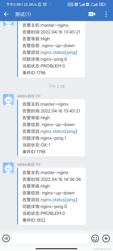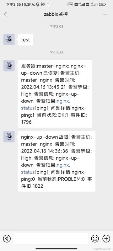 - nginx關(guān)停服務(wù),測試是否能通過微信告警。