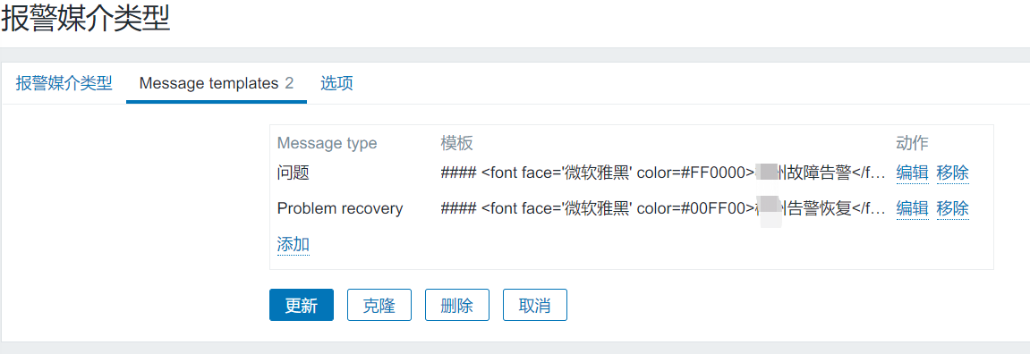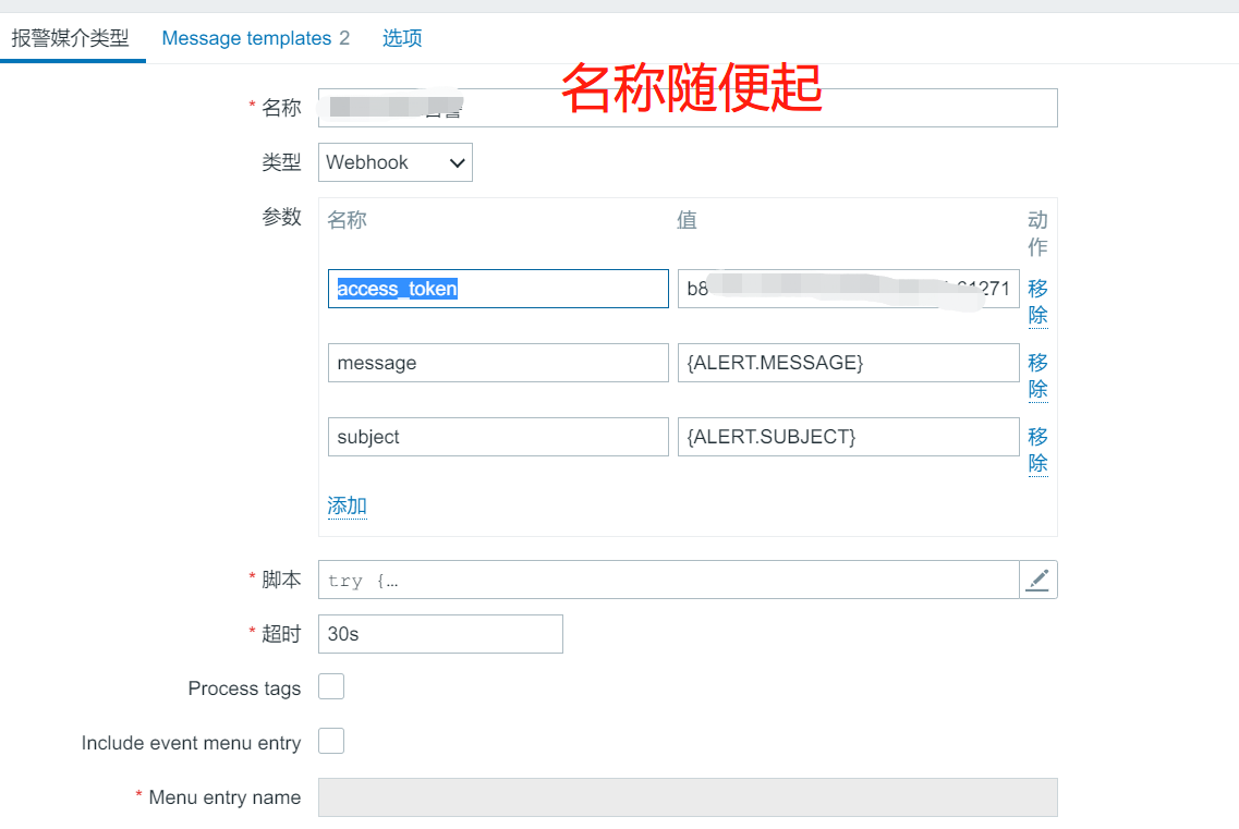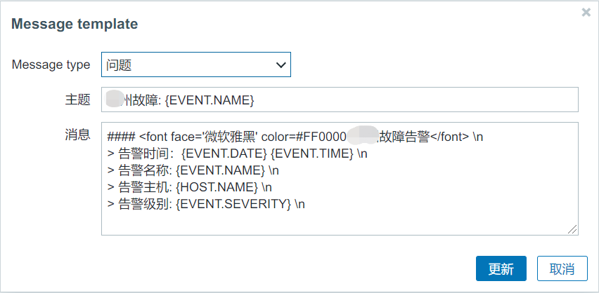 try { Zabbix.Log(4, "params= "+value); params = JSON.parse(value); req = new CurlHttpRequest(); timest = Date.now() data = {}; result = {}; req.AddHeader("Content-Type: application/json"); data.msgtype = "markdown"; // 對應 message參數 data.markdown = {"title" : params.subject, "text" : params.message.replace(/\\n/g, "\n").replace(/awesometimestamp/g, timest)}; Zabbix.Log(4, "markdown= "+JSON.stringify(data.markdown)); // 對應 user參數 data.at = {"atMobiles": [], "isAtAll": "false"}; // 釘釘機器人 resp = req.Post("https://oapi.dingtalk.com/robot/send?access_token=" + params.access_token,JSON.stringify(data) );} catch (error) {}return JSON.stringify(result);然后到消息模板
