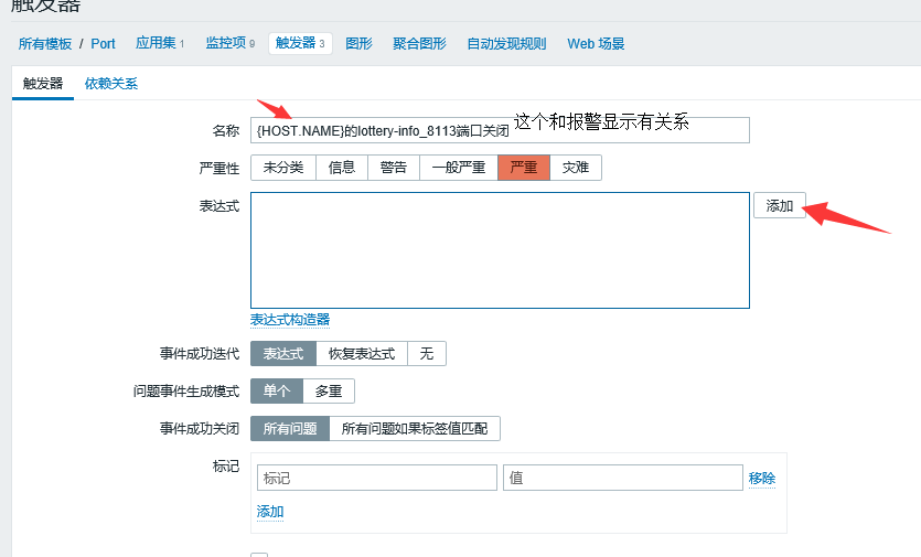4.創建觸發器,{HOST.NAME}將獲取主機名,用作報警顯示。表達式點擊添加,或復制其他自帶觸發器的值進行修改。
