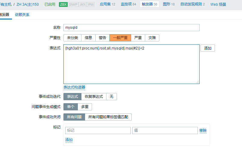 max(#2)}=2 :表示最后兩次的接收到的值都是2個進程(ps -ef 看到 mysqld 的進程為兩個所以=2 ),說明mysqld進程在運行,則出發報警。