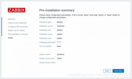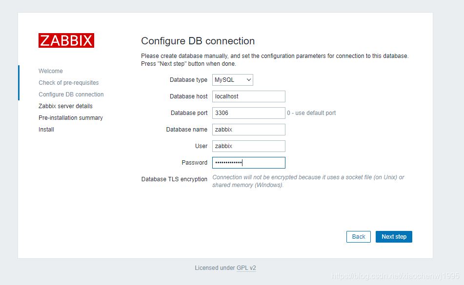 輸入連接到數(shù)據(jù)庫(kù)的詳細(xì)信息。Zabbix 數(shù)據(jù)庫(kù)必須已經(jīng)創(chuàng)建
