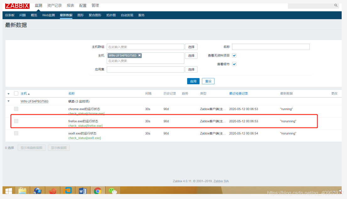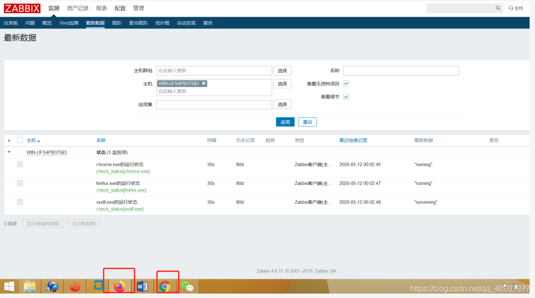 自動發(fā)現(xiàn)填入了三個exe程序名,其中xxxll.exe為不存在的exe,為了驗證效果,現(xiàn)在把firefox.exe程序關(guān)掉,看一下他的最新數(shù)據(jù)是否會顯示成norunning。