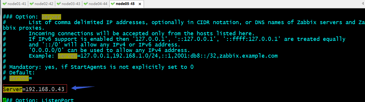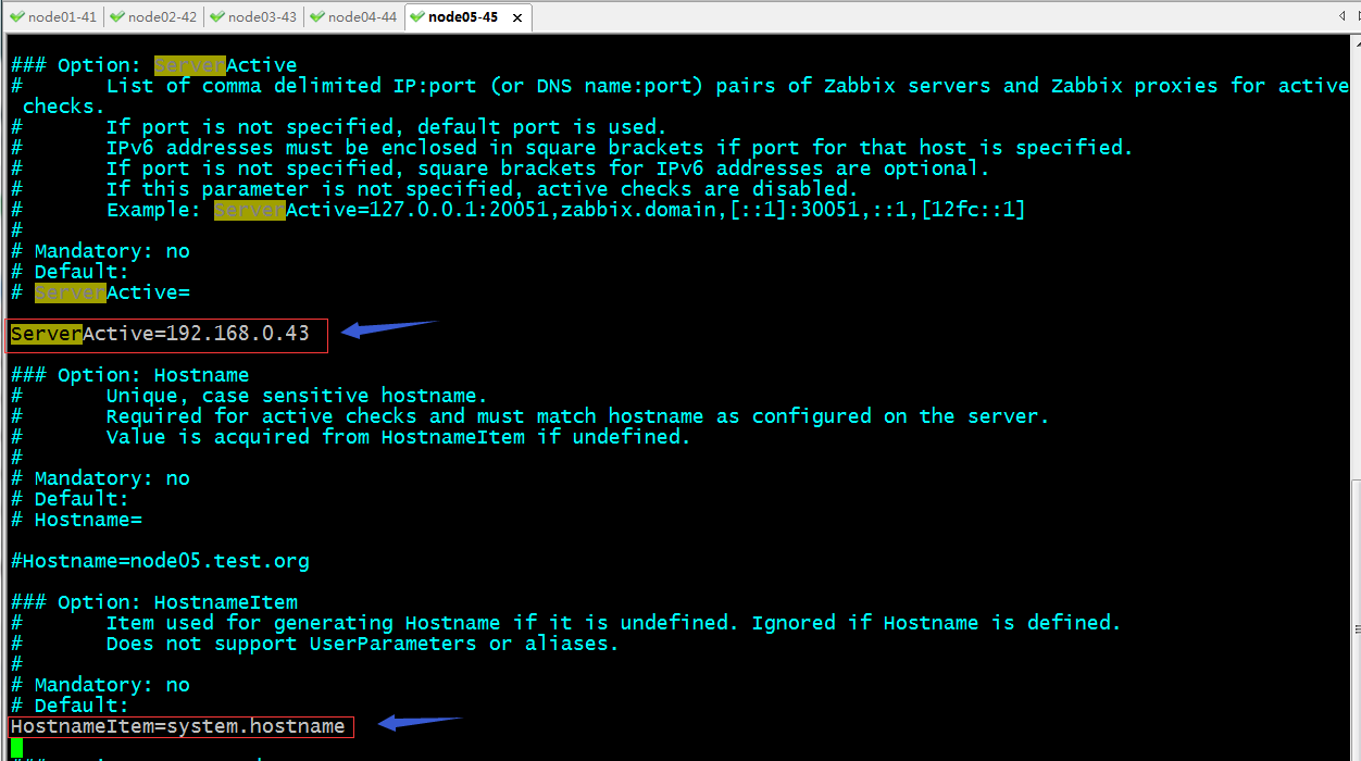 [root@node05 ~]# grep -Ei ^[a-z] /etc/zabbix/zabbix_agentd.conf PidFile=/var/run/zabbix/zabbix_agentd.pidLogFile=/var/log/zabbix/zabbix_agentd.logLogFileSize=0Server=192.168.0.43ServerActive=192.168.0.43HostnameItem=system.hostnameInclude=/etc/zabbix/zabbix_agentd.d/*.conf[root@node05 ~]#