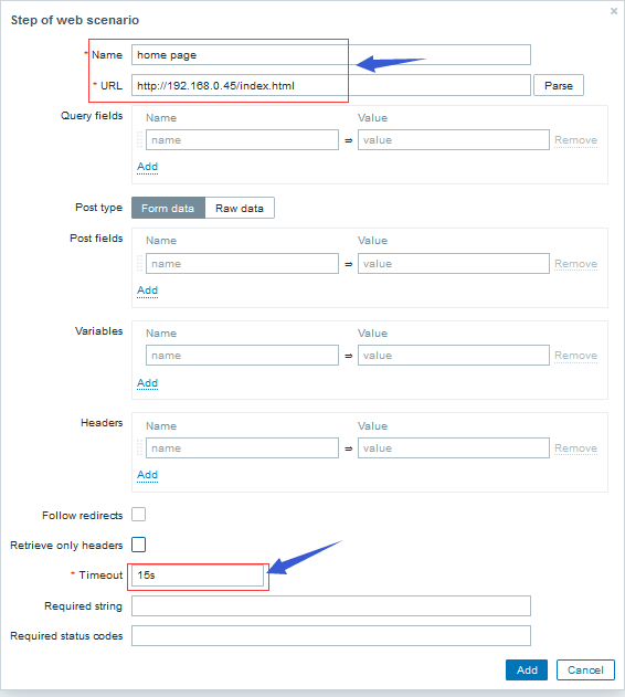 提示:如果沒有驗證需求,最后的authentication可以選擇不填寫;最后添加好web url后點擊Add就把對應的web 頁面添加到zabbix 監控中了;