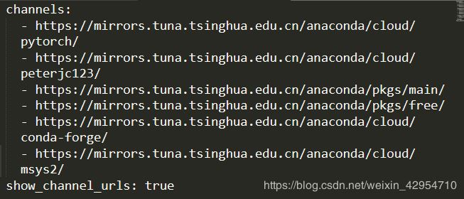 conda config --add channels https://mirrors.tuna.tsinghua.edu.cn/anaconda/cloud/msys2/ conda config --add channels https://mirrors.tuna.tsinghua.edu.cn/anaconda/cloud/conda-forge/ conda config --add channels https://mirrors.tuna.tsinghua.edu.cn/anaconda/pkgs/free/conda config --add channels https://mirrors.tuna.tsinghua.edu.cn/anaconda/pkgs/main/ conda config --add channels https://mirrors.tuna.tsinghua.edu.cn/anaconda/cloud/peterjc123/conda config --add channels https://mirrors.tuna.tsinghua.edu.cn/anaconda/cloud/pytorch/conda config --set show_channel_urls yes