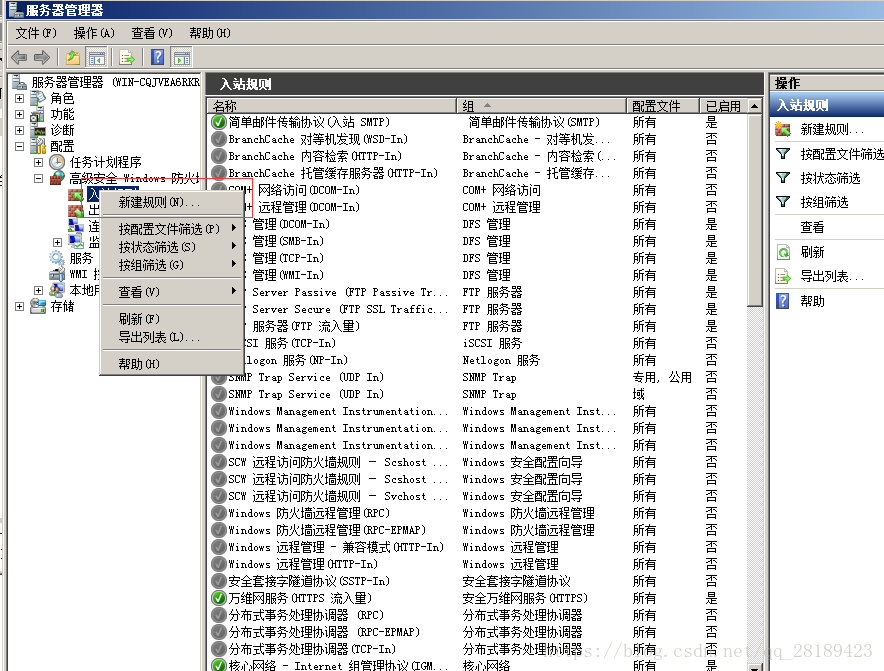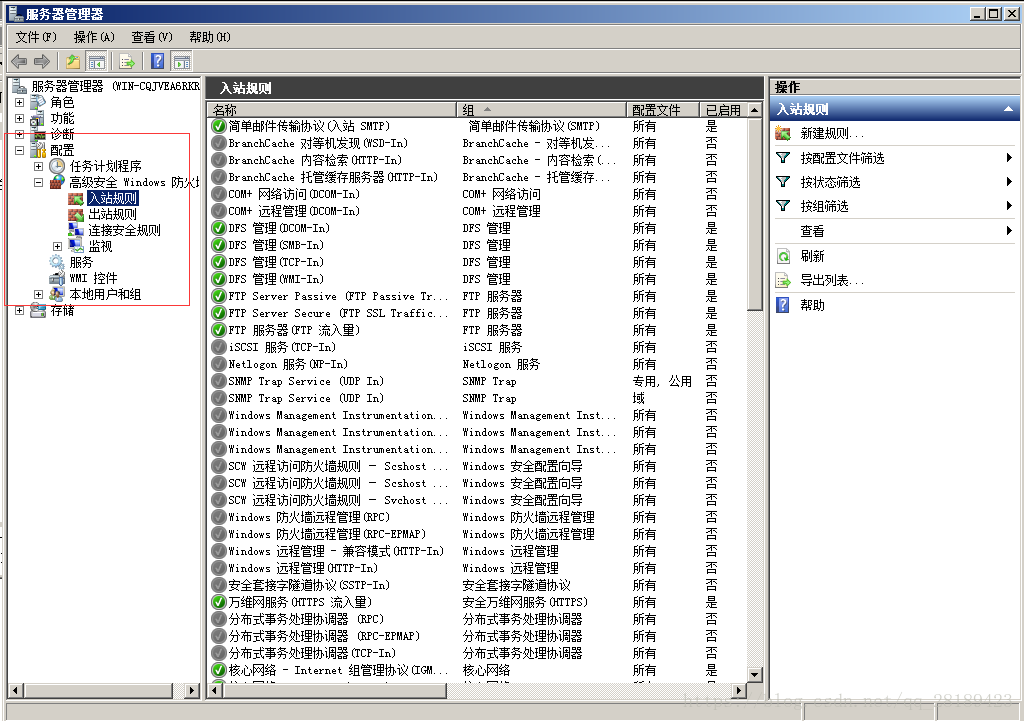 打開服務器管理器->配置->高級安全windows防火墻設置->入站規則