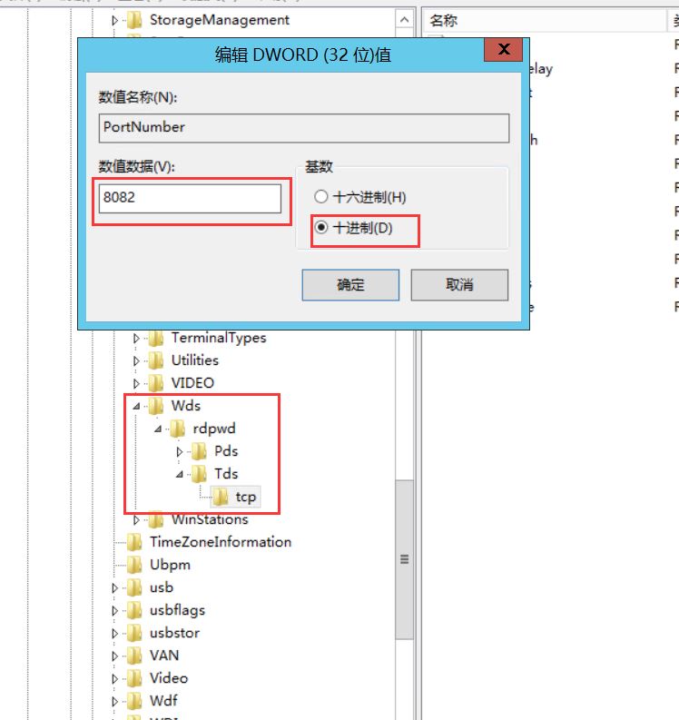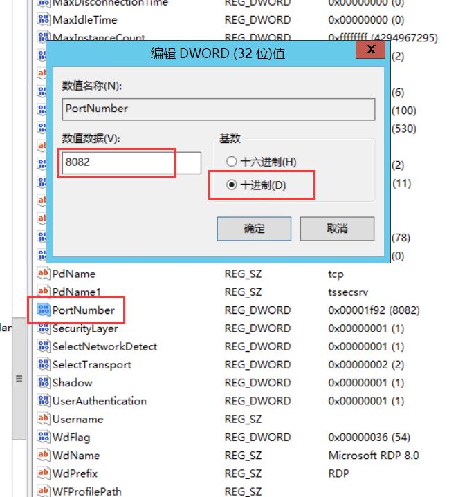 找到后,按照下列圖示步驟找到遠程桌面端口號并進行修改,注意是修改兩個注冊表數值,需要統(tǒng)一,這里我設置為8082,避免使用熟知端口